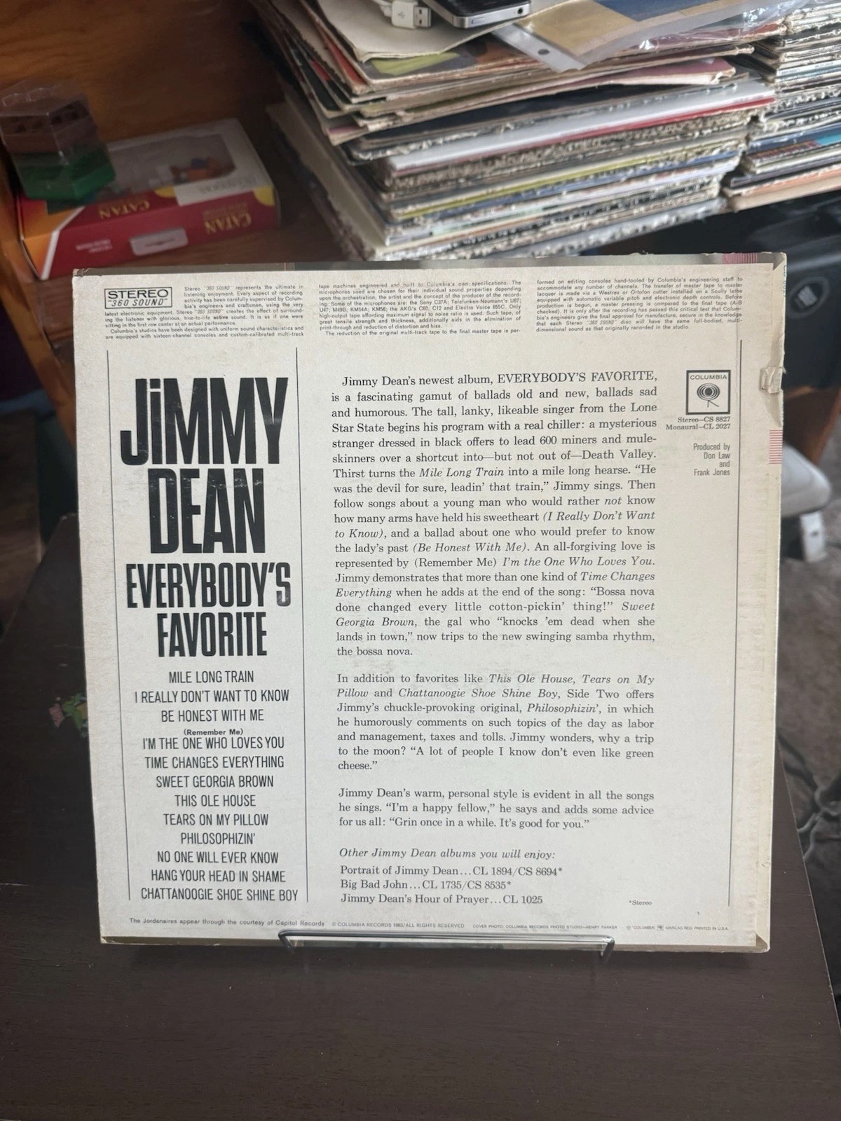 The product is a vinyl LP by artist Jimmy Dean titled “Everybody’s Favorite.” It has a speed of 33 RPM and is made of vinyl material. The record is in good condition and belongs to the country genre. With a record size of 12″, this LP from the record label LPS is a must-have for any vinyl record collector or fan of country music.