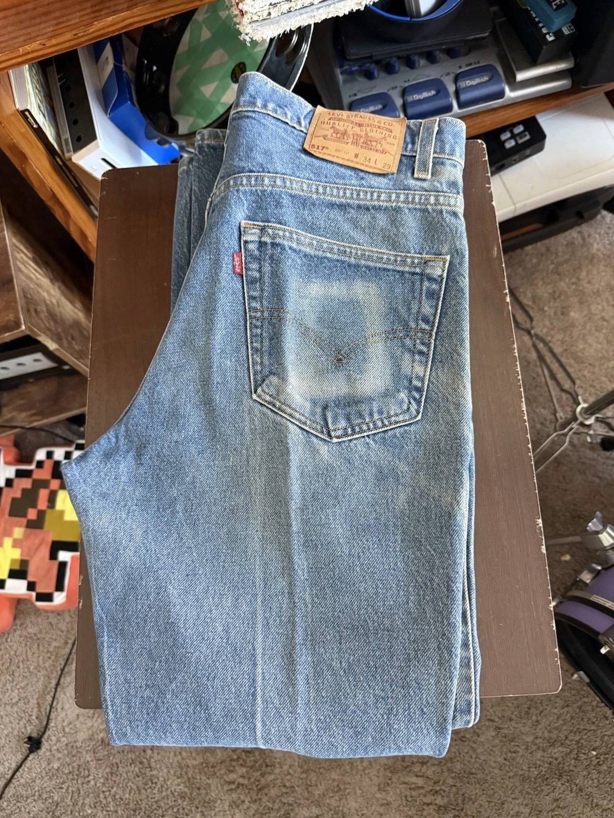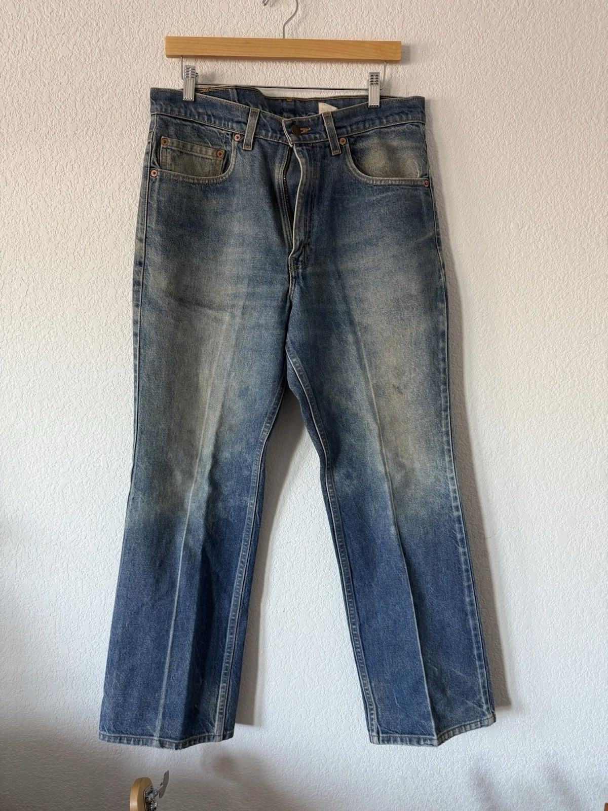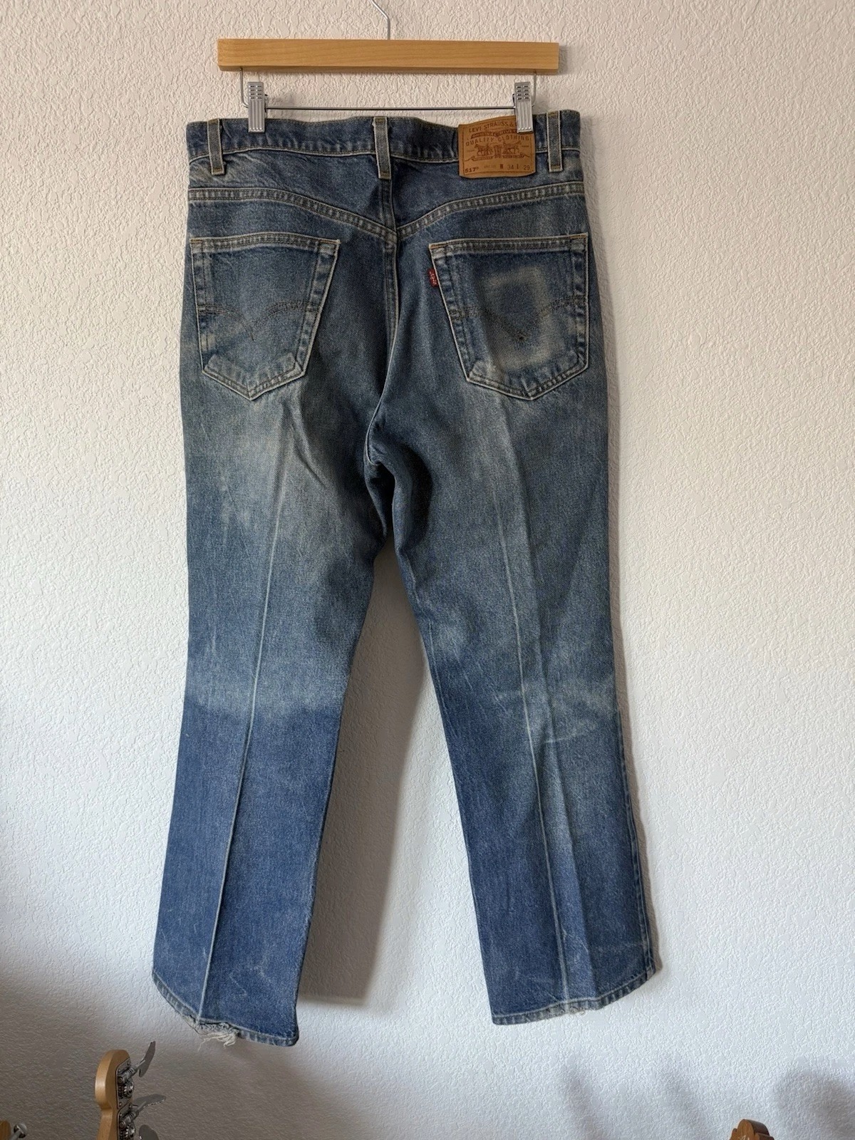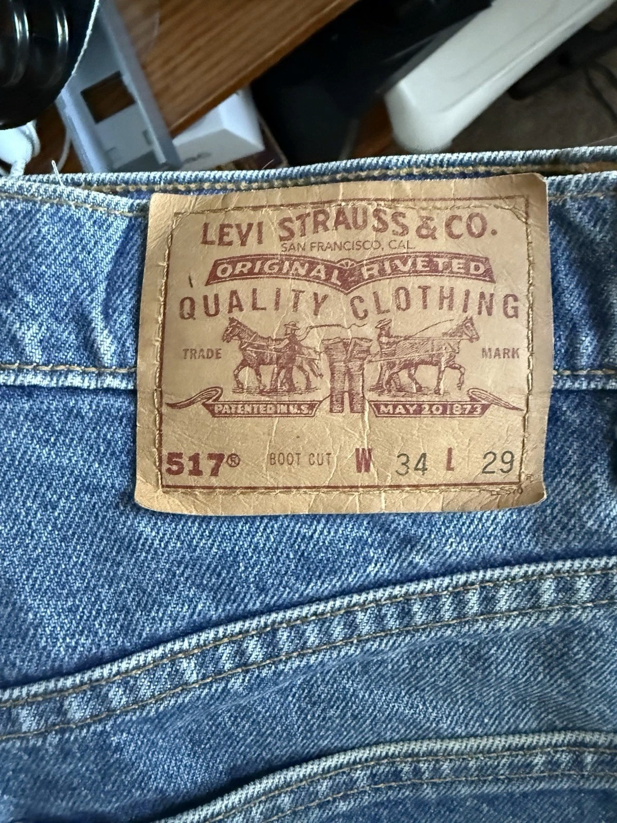 The product is a pair of Levi’s 517 jeans for men in a blue color with a medium wash. These regular fit jeans feature a bootcut style and are made of cotton denim. The size is 34×29 inches, with a slim fit and distressed details for a trendy look. Perfect for a cowboy or rodeo theme, these Y2K vintage-inspired jeans are a stylish addition to any wardrobe. Made in Mexico, these Levi’s jeans combine classic style with modern design for a versatile and on-trend piece.