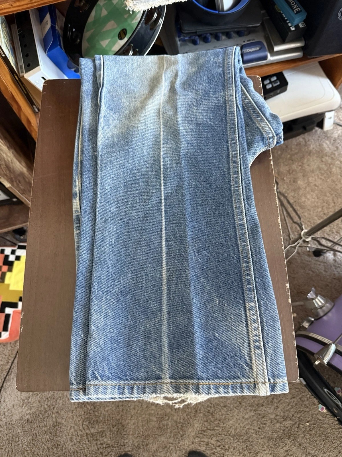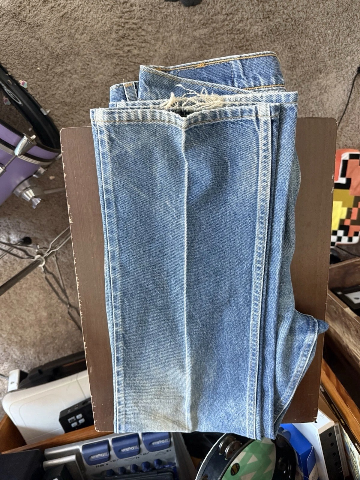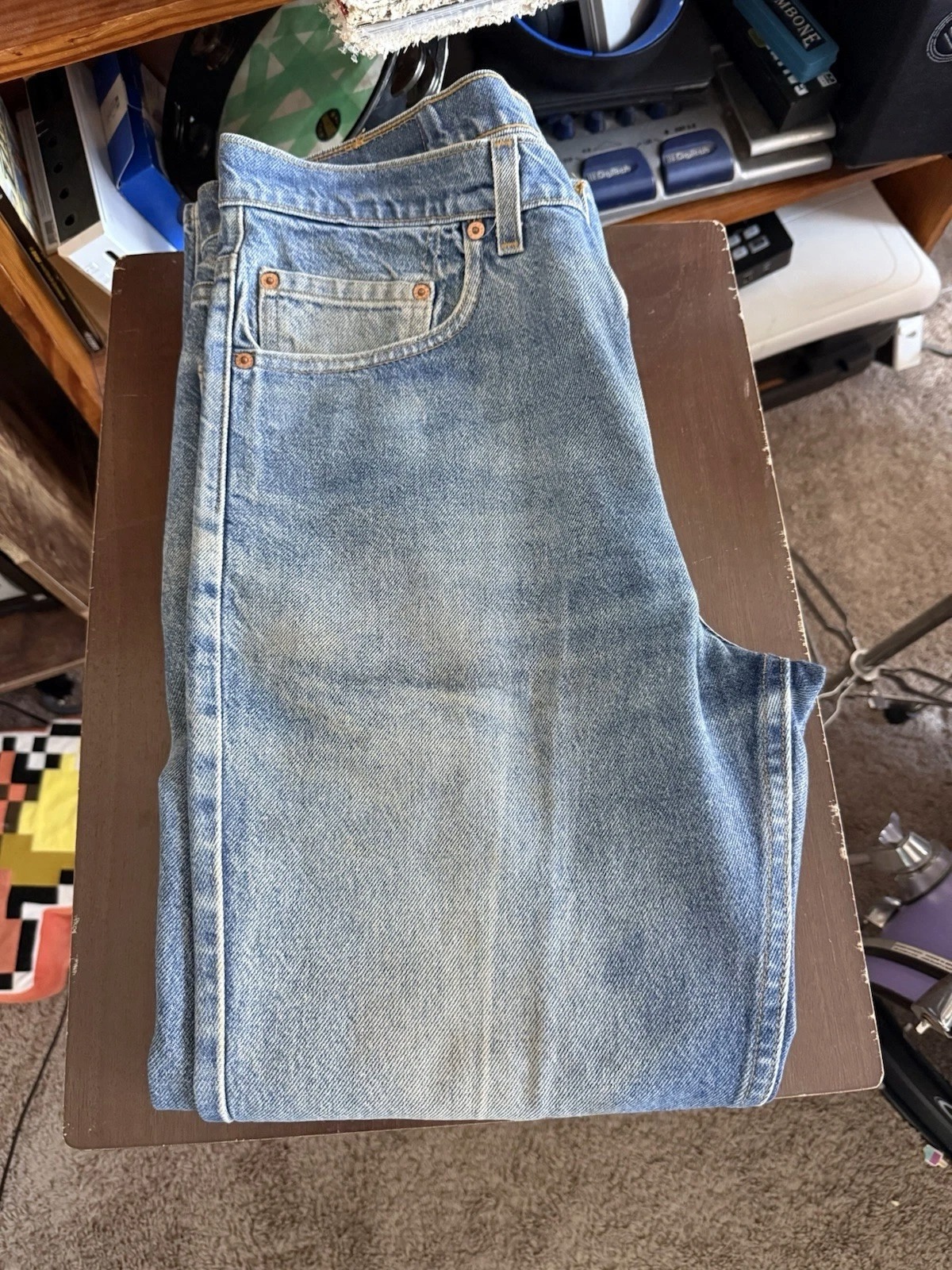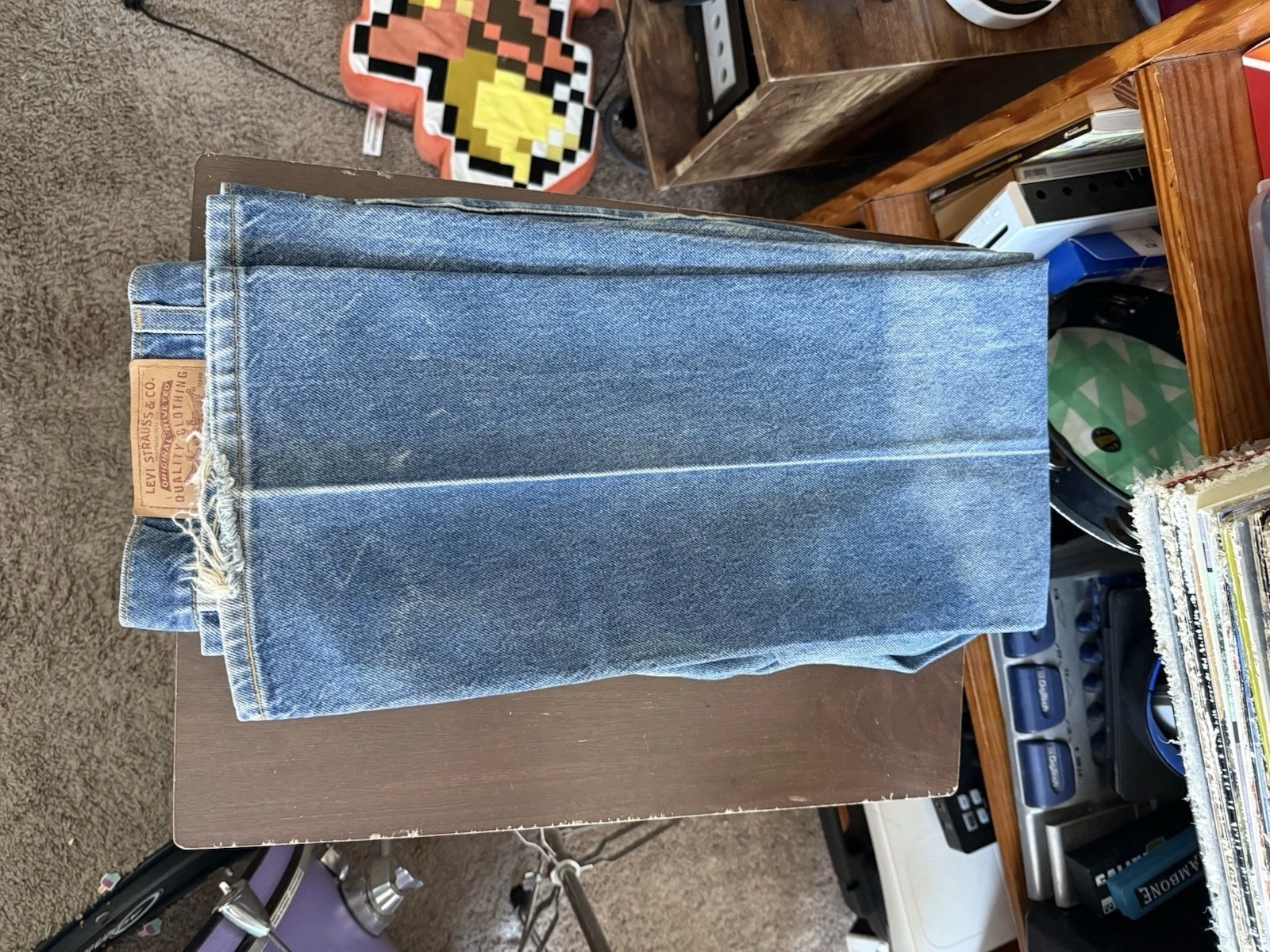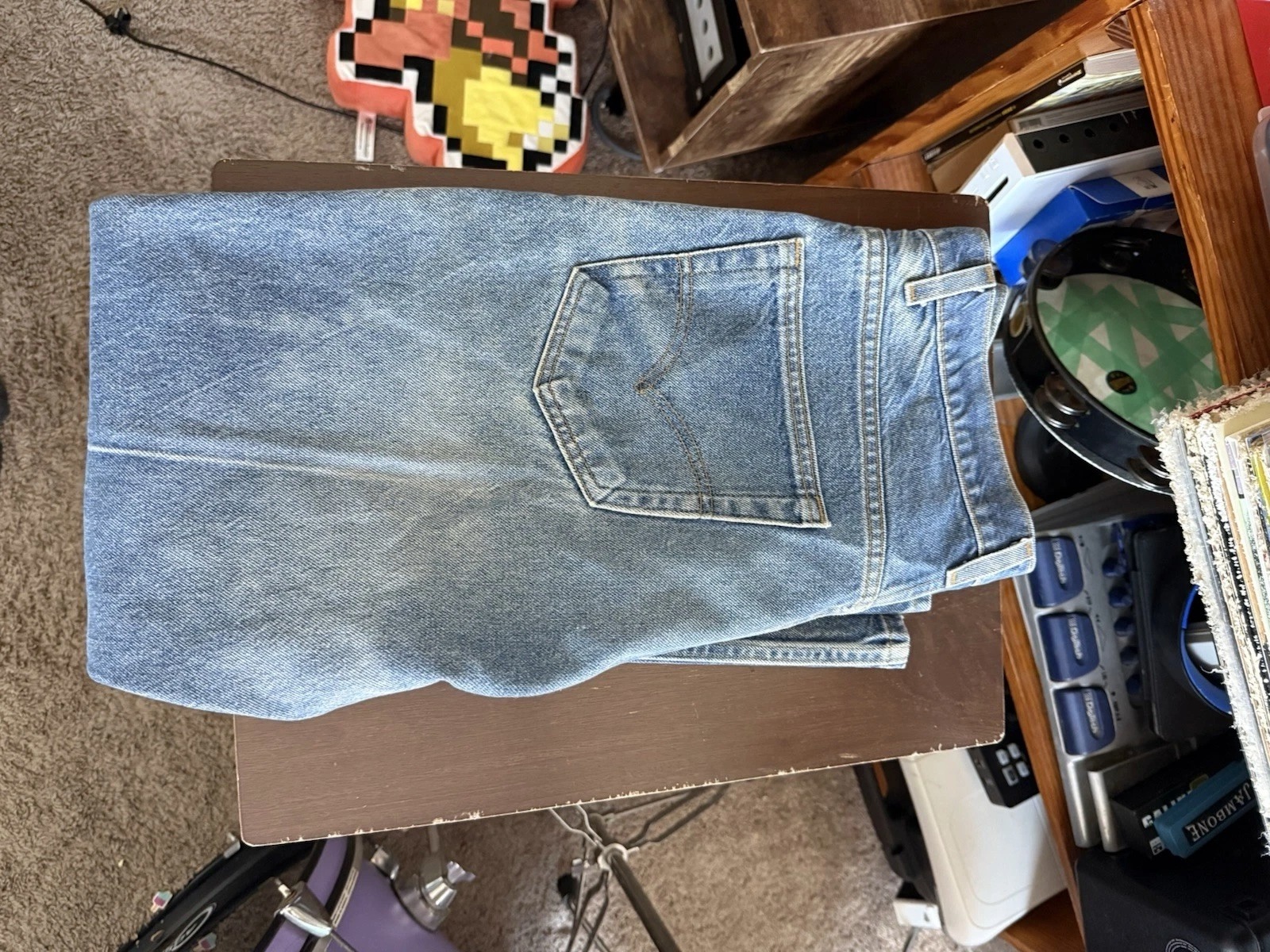 The product is a pair of Levi’s 517 jeans for men in a blue color with a medium wash. These regular fit jeans feature a bootcut style and are made of cotton denim. The size is 34×29 inches, with a slim fit and distressed details for a trendy look. Perfect for a cowboy or rodeo theme, these Y2K vintage-inspired jeans are a stylish addition to any wardrobe. Made in Mexico, these Levi’s jeans combine classic style with modern design for a versatile and on-trend piece.