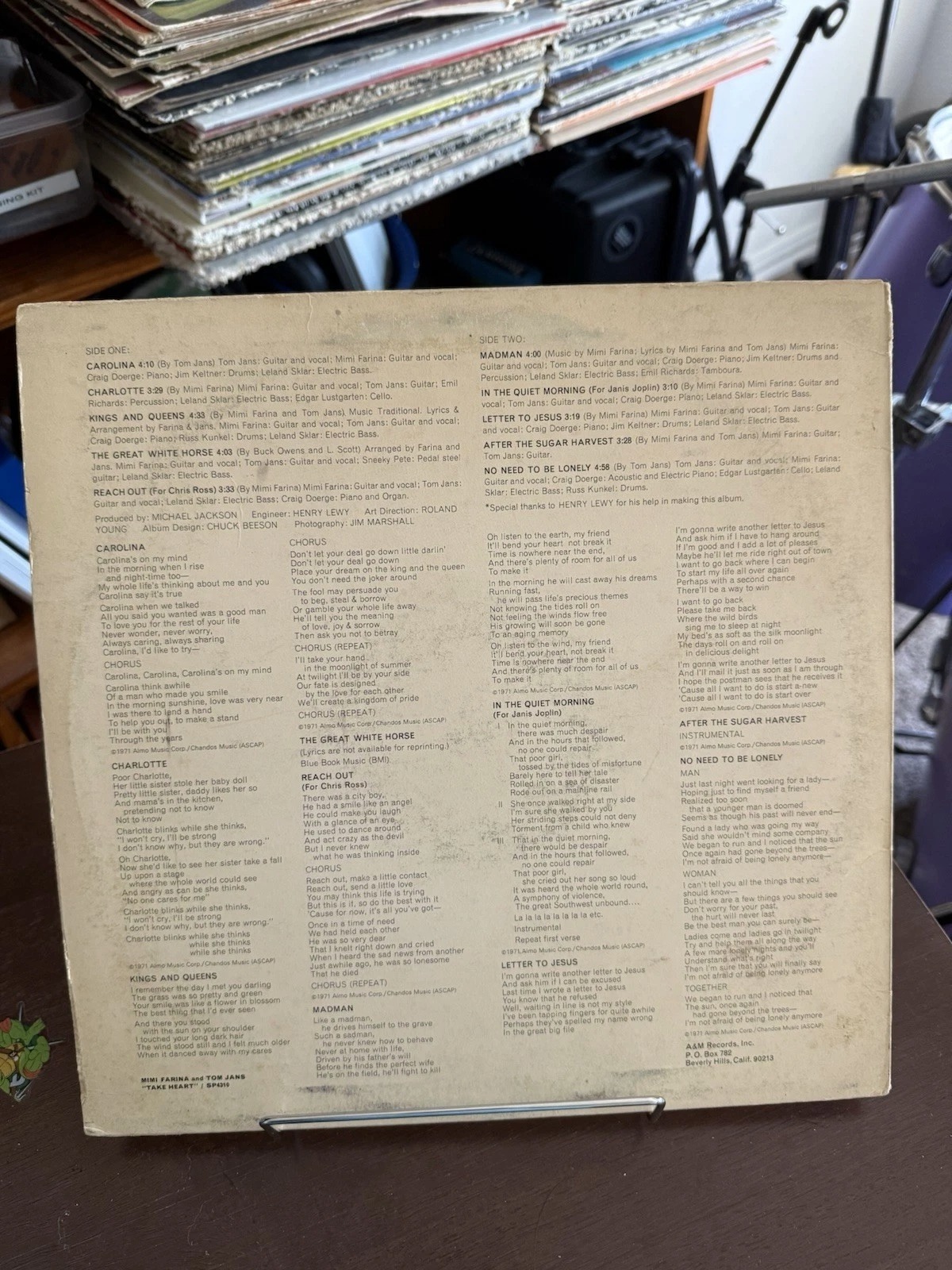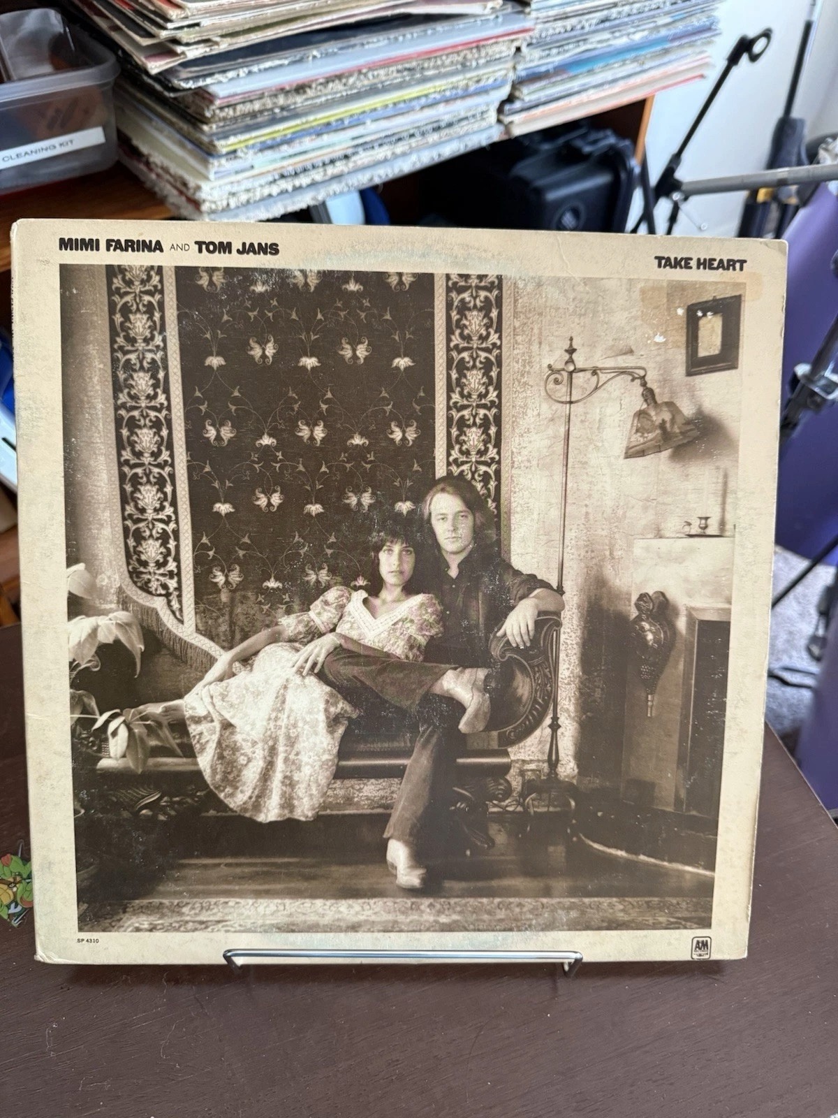 The product is a vinyl LP titled “Take Heart” by Mimi Farina and Tom Jans, released under A&M Records. This folk rock record features a 33 RPM speed and comes in a cardboard sleeve. The black vinyl record is in good condition (G) as well as the sleeve, making it a valuable addition to any music collection for fans of folk music from the 1950-1999 era.