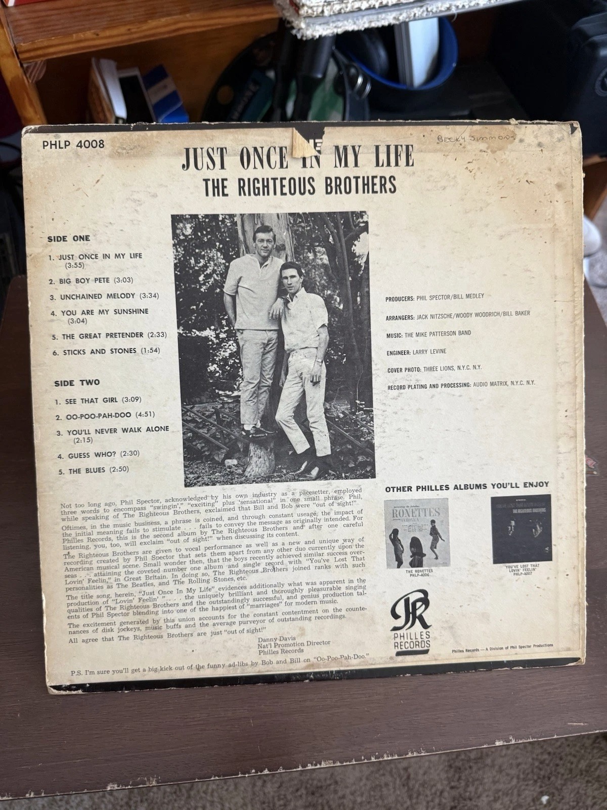 The product is a 1965 vinyl LP record by The Righteous Brothers titled “Just Once In My Life.” This edition, categorized as the Best Of, features rock music in English, pressed on black vinyl in a 12″ format. The record was manufactured in the United States and is a valuable collector’s item reflecting the era of the 1960s. Perfect for music enthusiasts looking to add a classic piece of music history to their collection, this LP encapsulates the iconic sound of The Righteous Brothers from that time period.